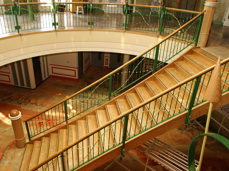 Duinrell, daar kikker je van op! Bij zo'n bijzondere locatie hoort ook een unieke trap en deze is dan ook ontworpen door een architect. Wij plaatsten hier een steektrap met gebogen bomen voor een theatraal effect. Deze royale steektrap met gebogen, uitwaaierende trapbomen is uitgevoerd in Amerikaans esdoorn, wat ook wel hard maple wordt genoemd. Er zit een bruine doorlopende antislipstrip van rubber onder de treden. De balustraden zijn van gemoffeld staal. Het resultaat mag er zeker zijn!