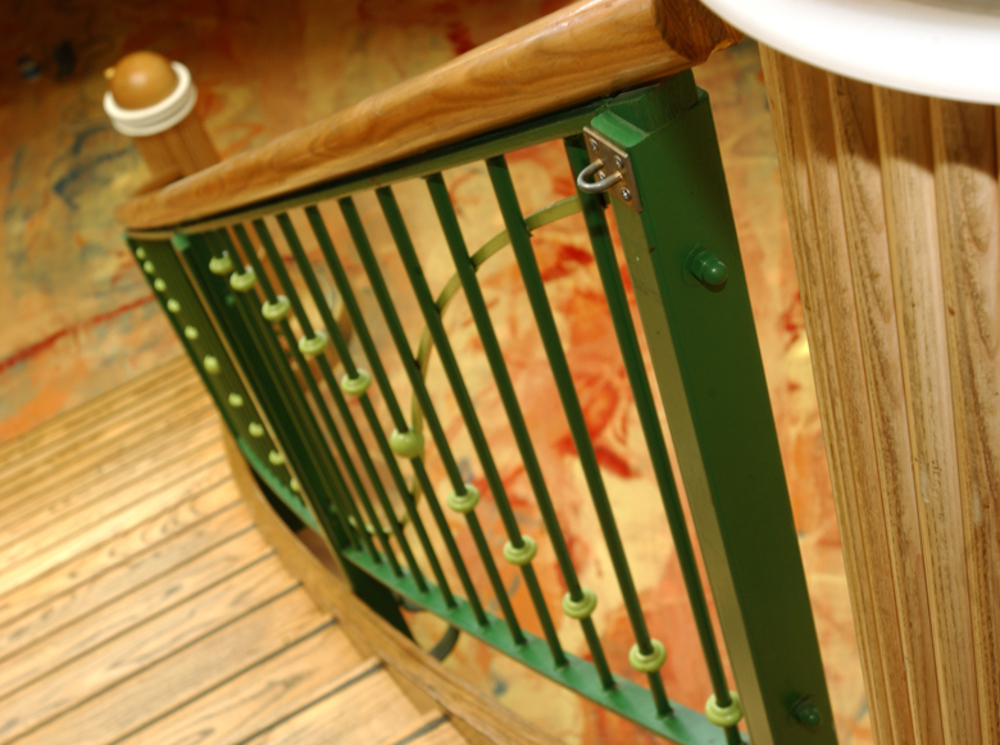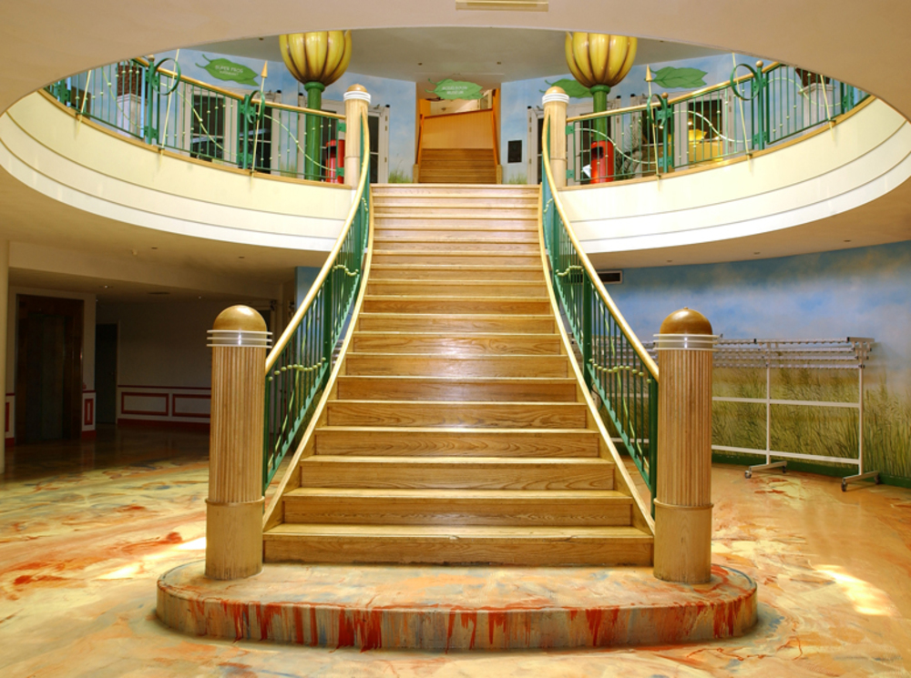 Duinrell, daar kikker je van op! Bij zo'n bijzondere locatie hoort ook een unieke trap en deze is dan ook ontworpen door een architect. Wij plaatsten hier een steektrap met gebogen bomen voor een theatraal effect. Deze royale steektrap met gebogen, uitwaaierende trapbomen is uitgevoerd in Amerikaans esdoorn, wat ook wel hard maple wordt genoemd. Er zit een bruine doorlopende antislipstrip van rubber onder de treden. De balustraden zijn van gemoffeld staal. Het resultaat mag er zeker zijn!